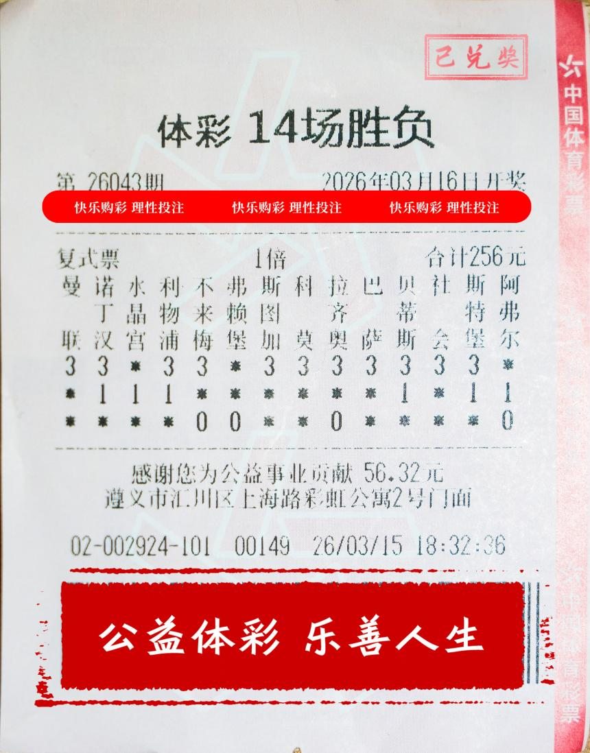 2026年3月16日,体彩传统足彩足球14场胜平负第26043期开奖,世界共中出1注一等奖,单注奖金500万元。这注一等奖出自贵州省遵义市汇川区上海路彩虹公寓2号的5202002924体彩门店。